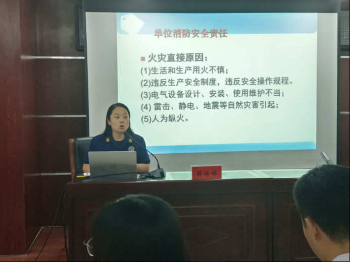 培训会上,薛婷婷同志通过播放近期火灾事故视频,生动形象的向大家展现了火灾的危害性,继而深入剖析火灾发生的原因。同时,结合机关工作环境,详细讲解了消防安全常识、排查消除火灾隐患措施及火灾发生时自防、自救及逃生技能,全体干部职工认真学习,进一步提高了消防灭火安全知识。